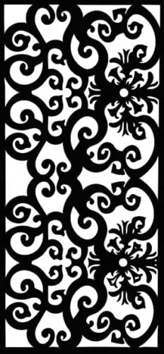 This stunning ornate scroll pattern features an intricate network of flowing curves, elegant spirals, and decorative swirls arranged in a sophisticated vertical rectangular format. The design showcases classical ornamental elements with graceful S-curves that interweave throughout the composition, creating a sense of movement and elegance. Delicate floral motifs and leaf-like details are strategically placed within the scrollwork, adding botanical charm to the overall aesthetic. The black and white contrast emphasizes the intricate cutout areas, making this pattern ideal for creating dramatic shadow effects when backlit or used as a decorative screen.