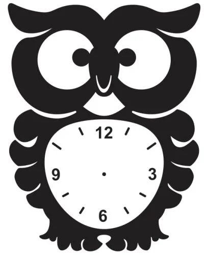 This charming owl clock face design features a stylized owl silhouette with prominent circular eyes and distinctive feathered details. The design showcases clean black lines forming the owl’s body, wings, and characteristic ear tufts at the top. The owl’s belly contains a perfect circular clock face with traditional hour markers at 12, 3, 6, and 9 positions, along with minute marks around the perimeter. The design maintains excellent symmetry with decorative wing elements extending from both sides, creating a balanced and visually appealing timepiece that combines functionality with whimsical charm.