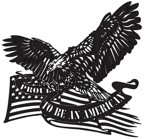 This striking patriotic design features a magnificent eagle in flight with outstretched wings, soaring above a flowing American flag banner. The eagle is rendered in intricate detail with carefully crafted feather patterns, sharp talons, and a proud beak that captures the majestic nature of America’s national bird. Below the eagle, a beautifully curved banner displays the stars and stripes of the American flag with flowing ribbons that add dynamic movement to the composition. The text “PROUD TO BE AN AMERICAN” is elegantly incorporated into the banner design, creating a powerful patriotic statement. The entire design maintains clean vector lines perfect for CNC cutting and laser engraving applications.