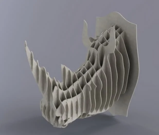 The design incorporates precision-engineered interlocking tabs and slots for easy assembly without requiring additional fasteners or glue. Multiple layers create realistic depth and dimensional accuracy that brings the rhino head to life. The scalable vector format allows for various sizes from small decorative pieces to large statement wall art. Clean cutting lines ensure smooth edges and professional finish quality. The modular design approach makes shipping flat-packed pieces economical while achieving impressive three-dimensional results when assembled.