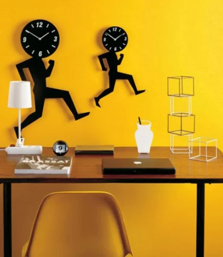 This innovative wall art design features two dynamic human silhouettes in running poses, each carrying a clock face as their head. The larger figure appears to be chasing the smaller one, creating a playful narrative about time and motion. The silhouettes are precisely cut with smooth, flowing lines that capture the essence of human movement in mid-stride. Each figure shows detailed running postures with bent arms and legs positioned to convey speed and energy. The clock faces are perfectly proportioned circles that integrate seamlessly with the human forms, creating a surreal and artistic interpretation of time passing.
