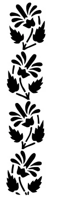 This elegant Scottish thistle border pattern features four distinct thistle motifs arranged in a vertical decorative border design. Each thistle element showcases the characteristic spiky crown of the traditional Scottish national flower, accompanied by detailed serrated leaves that flow naturally along the stems. The design captures the authentic appearance of thistles with their distinctive bulbous flower heads crowned with radiating spikes, creating a bold and recognizable silhouette. The pattern maintains consistent spacing between each thistle motif, making it perfect for creating seamless repeating borders. The leaves are carefully crafted with jagged edges that mirror the natural serrated appearance of real thistle foliage, while the stems curve gracefully to create visual flow throughout the vertical composition.