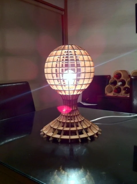 This elegant spherical lamp serves multiple purposes across residential and commercial settings. Perfect as a bedside table lamp, living room accent lighting, or office desk illumination. The sophisticated design makes it ideal for modern home decor, architectural offices, design studios, and contemporary restaurants. Crafters can produce these lamps for sale at craft fairs, online marketplaces, or custom lighting boutiques. The unique geometric aesthetic appeals to clients seeking modern, minimalist lighting solutions. Educational institutions can use this project for design and engineering courses, demonstrating principles of geometric construction and laser cutting techniques. Interior designers frequently specify custom lighting pieces like this for high-end residential and commercial projects.