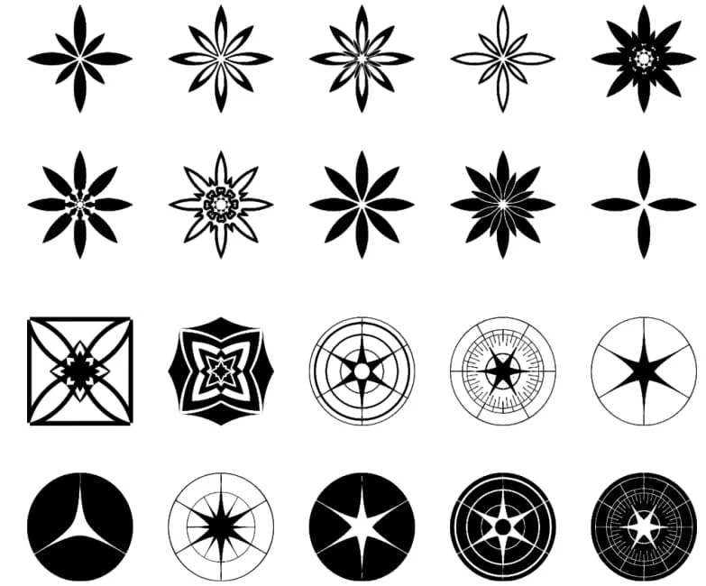 This comprehensive collection features 20 distinct star flower and compass rose designs, each showcasing intricate geometric patterns and nautical-inspired elements. The designs range from simple 4-petal flower motifs to complex 16-point compass roses with detailed directional markings. Each pattern displays perfect radial symmetry with varying petal shapes – some featuring pointed star-like projections, others with rounded organic curves. The collection includes solid black silhouettes, outlined versions, and designs with internal geometric details. Several compass rose variations feature traditional navigation symbols, degree markings, and decorative center medallions. The artistic styles blend floral aesthetics with maritime navigation symbols, creating versatile designs suitable for both decorative and functional applications.