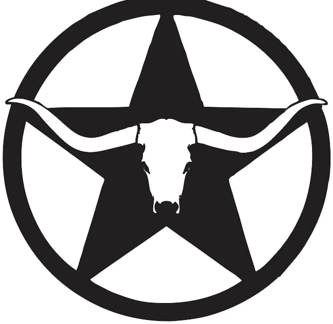 This striking western-themed design features a bold five-pointed Texas star with a detailed longhorn bull head silhouette positioned at the center. The design is enclosed within a perfect circle, creating a balanced and symmetrical composition that embodies the spirit of the American Southwest. The bull head showcases distinctive curved horns extending horizontally, with fine details including facial features and nostril definition. The star’s points are evenly distributed, creating strong geometric lines that contrast beautifully with the organic curves of the bull silhouette. The overall design maintains clean vector lines perfect for precision CNC cutting and laser engraving applications.