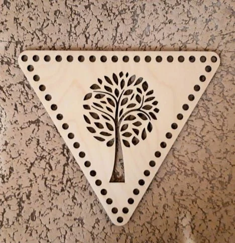 This exquisite triangular crochet base features a stunning tree of life motif at its center, surrounded by precisely positioned holes for yarn threading. The triangular shape measures approximately 6 inches per side, creating a perfect equilateral triangle foundation for your crochet and crafting projects. The central tree design showcases intricate branching patterns with detailed leaves, symbolizing growth, strength, and connection. Two rows of evenly spaced holes line the perimeter – larger holes along the outer edge and smaller guide holes creating a double border effect. The clean, geometric precision of this design makes it ideal for both beginners and experienced crafters seeking a professional-quality base.