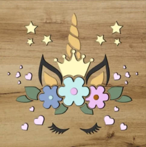 This enchanting unicorn face design features a beautifully detailed composition perfect for laser cutting and CNC machining. The design showcases a twisted spiral horn in golden yellow tones, positioned centrally above pointed unicorn ears in matching colors with dark outlines. A delicate crown sits elegantly between the horn and ears, creating a regal appearance. The focal point is a stunning floral arrangement consisting of three blooming flowers in soft pastel colors – blue, light blue, and pink – each with detailed centers and surrounded by green leaves. Decorative elements include multiple small stars scattered above the design and tiny hearts floating around the composition. The unicorn’s closed eyelashes are depicted with elegant curved lines, giving the design a peaceful, sleeping expression. The entire piece is arranged symmetrically on a wooden background, demonstrating the precision and beauty achievable through laser cutting techniques.