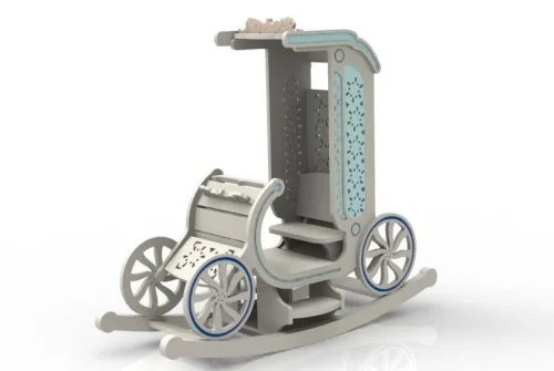 This exquisite vintage carriage rocking horse design combines classic elegance with functional craftsmanship. The design features a beautifully detailed carriage body with an ornate domed roof, decorative side panels with intricate perforated patterns, and elegant spoked wheels. The carriage sits gracefully on curved rockers, creating a charming toy that evokes the romance of horse-drawn carriages from a bygone era. The design incorporates multiple layers and components that fit together seamlessly, with careful attention to structural integrity and visual appeal. The decorative elements include delicate lattice work on the side panels and detailed wheel spokes that add authentic carriage aesthetics.