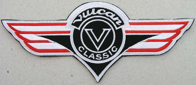 This striking winged badge design features the iconic Vulcan Classic V emblem at its center, surrounded by elegant swept wings with distinctive red and white striped patterns. The design showcases a circular black center containing the letter ‘V’ encircled by ‘Vulcan Classic’ text, creating a professional automotive-inspired logo. The wings extend symmetrically on both sides with alternating red and white horizontal stripes that gradually taper to sharp points, giving the entire design a dynamic sense of motion and speed. The overall shape forms a classic aviation or automotive badge style with clean lines and bold contrast between the black center medallion and the vibrant striped wing elements.