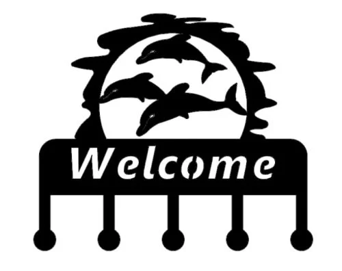 This stunning welcome sign features an artistic silhouette design showcasing three graceful dolphins leaping through ocean waves within a decorative circular frame. The main focal point displays the word “Welcome” in elegant script lettering on a solid rectangular base. Below the welcome message, five evenly-spaced circular hooks provide practical key storage functionality. The dolphins are positioned dynamically, creating a sense of movement and ocean life, while the surrounding circular border adds a sun-like radial pattern with pointed rays extending outward. The entire design maintains perfect symmetry and balance, combining both decorative marine artistry with functional home organization elements in one cohesive piece.