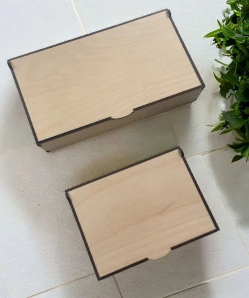 This elegant wooden box design features a sophisticated sliding lid mechanism that creates a smooth, seamless storage solution. The design consists of two perfectly sized rectangular boxes photographed against a clean white surface with decorative greenery. The larger box measures approximately 8 inches in length while the smaller companion box is roughly 5 inches, both featuring the same sliding lid construction. The natural wood grain visible on the light-colored surfaces creates an organic, minimalist aesthetic that complements modern and traditional decor styles. The precision-cut edges demonstrate the clean lines achievable through CNC laser cutting technology.